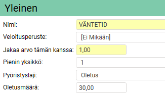 Luo artikkeli, jonka hintayksikkö on "Odotusaika" ja joka perustuu ulottuvuuteen [Ei Mikään]. Tämä ulottuvuus on tarkoitettu manuaalisiin Artikkeleihin varten, joissa numero syötetään eräriville. Ajatuksena on, että odotusaika ilmoitetaan kokonaisina minuutteina.