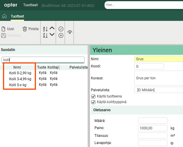 Luo tuote kullekin painoluokalle. Kirjoita nimessä paino tai jokin muu helposti tunnistettava tieto, sillä valitset tuotteet tilausten vastaanotto-riveillä.
