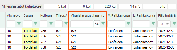 Jos käsittelette yhteislastauksia, voi olla hyödyllistä tietää, mihin yhteislastauksen tilausnumeroon tietty kuljetus tai tilaus kuuluu. Lisää sarake Yhteislastaustilausnro.