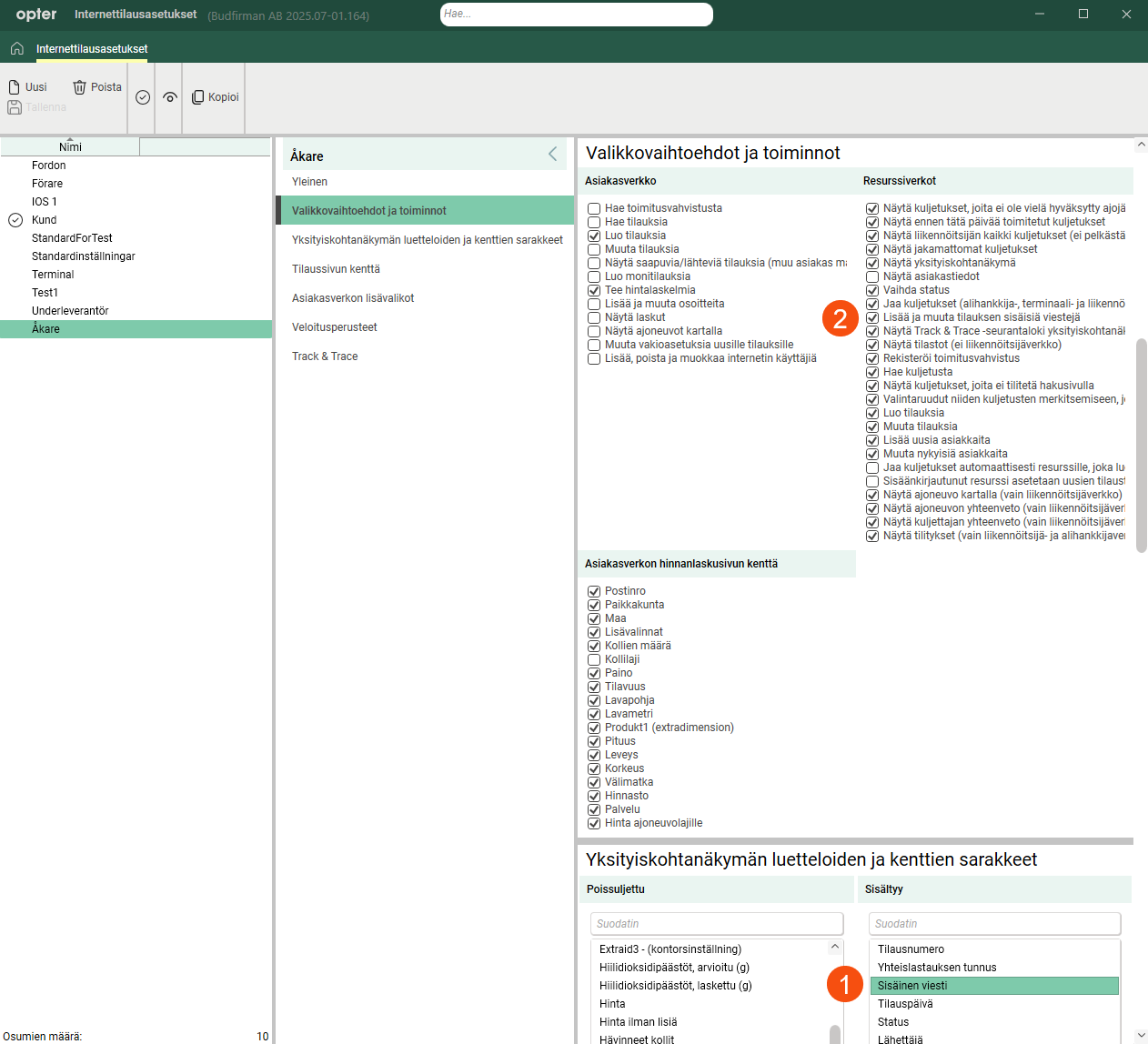 Asetukset on jaoteltu siten, että saraketta Sisäinen viesti voidaan näyttää kuljettajien ja alihankkijoiden alihankkijaverkossa ilman, että käyttäjät voivat muokata tai lisätä viestejä.