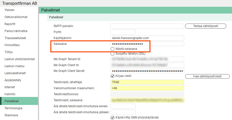 Toimistoasetusten Palvelimet-välilehdellä oleva SMTP-palvelimen salasana on nyt piilotettu, mutta sen voi näyttää valintaruudun avulla. Sama pätee EDI-siirtojen salasanoihin.