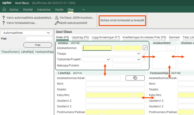 Tilausten vastaanoton ryhmien korkeus ja leveys tallennetaan järjestelmäänne Opter-järjestelmään tilauskohtaisesti. Tämä tarkoittaa, että jos käyttäjä muuttaa ryhmän leveyttä, se vaikuttaa kaikkiin käyttäjiin. Tämä voi aiheuttaa ei-toivottuja vaikutuksia, etenkin kun useat käyttäjät työskentelevät eri tietokoneilla, joiden resoluutio tai näytön koko vaihtelee.