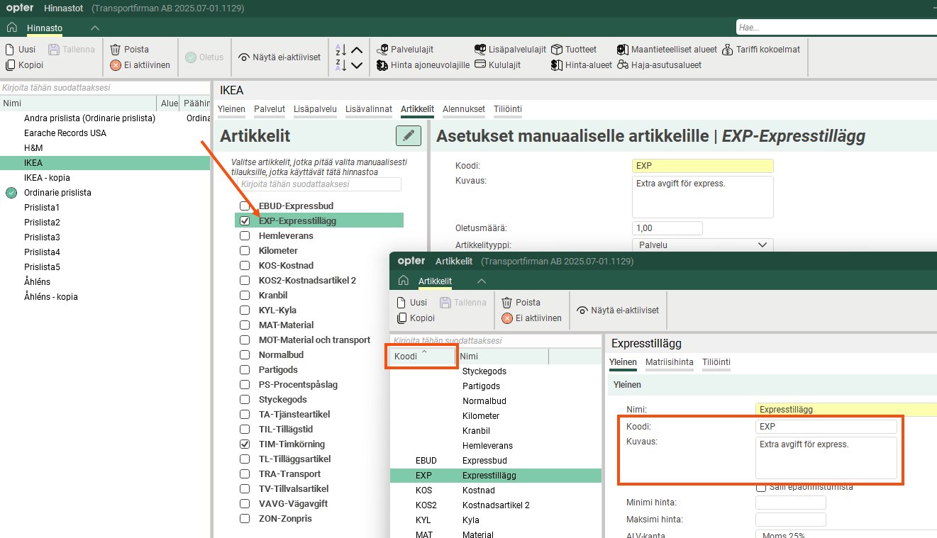Artikkeleiden koodit ja kuvaukset voidaan nyt syöttää suoraan artikkeli-rekisteriin, jossa artikkeleita voi myös lajitella artikkelikoodin mukaan. Hinnaston Artikkelit-välilehdessä näkyy nyt myös koodi artikkelin nimessä.