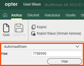 Valitse Automaattinen ja kirjoita hakukenttään tilausnumero, laskunumero, rahtikirjanumero, pakettinumero, lähettäjän viitenumero, vastaanottajan viitenumero tai lisätunnus 1–5. Paina Hae tai Enter-näppäintä. Opter etsii tällöin tilauksia, joiden tilauspäivä on viimeisten kolmen kuukauden ajalta.