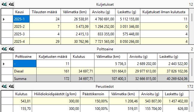 Tilastoraportista Yleiskatsaus voit muun muassa tarkistaa, puuttuuko joistakin kuljetuksista polttoaineenkulutus sarakkeesta Kuljetukset ilman kulutusta (taulukossa Kuljetukset).
