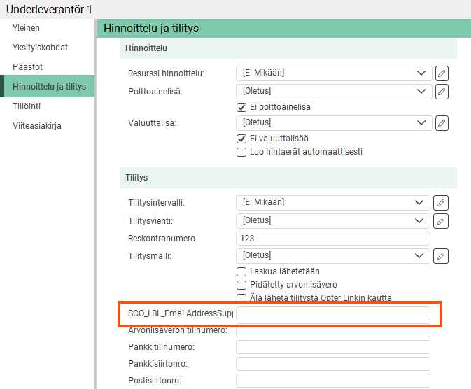 Nyt on mahdollista lähettää tilitykset muuhun sähköpostiosoitteeseen kuin siihen, johon ilmoitukset lähetetään. Kirjoita osoite alihankkijarekisterin Hinnoittelu ja tilitys-välilehden S-posti tilitysvienti-kenttään. Ilmoitukset lähetetään edelleen osoitteeseen, joka on merkitty välilehden Yhteystiedot alle Yleinen.