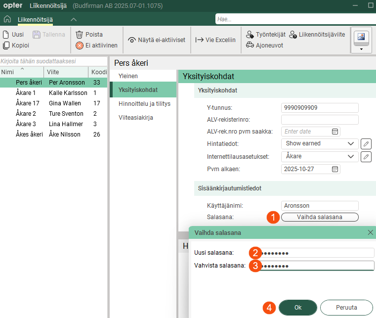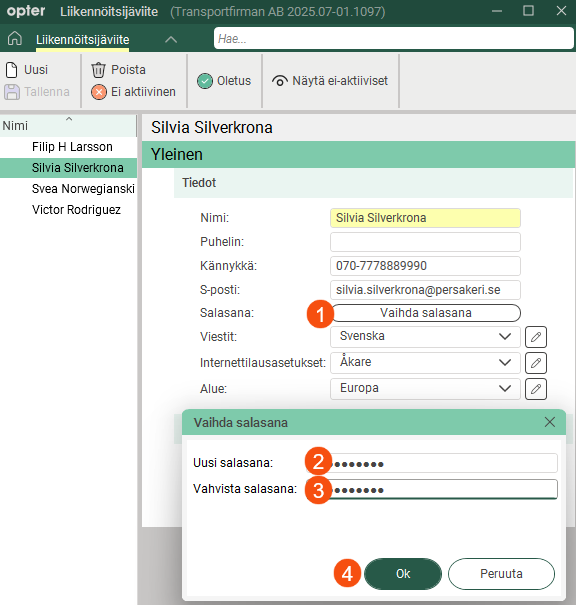Alihankkijoiden, kuljettajien ja liikennöitsijäviitteiden salasanat eivät enää näy rekistereissä. Jos joku on unohtanut salasanansa, voit luoda helposti uuden napsauttamalla Vaihda salasana välilehdellä Yksityiskohdat. Kirjoita uusi salasana kenttiin Uusi salasana ja Vahvista salasana ja napsauta sitten Ok.