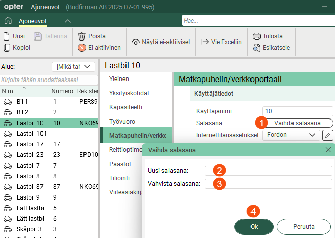 Työntekijöiden ja ajoneuvojen salasanoja ei enää näytetä rekistereissä. Jos joku on unohtanut salasanansa, voit luoda helposti uuden napsauttamalla Vaihda salasana välilehdellä Matkapuhelin/verkkoportaali. Kirjoita uusi salasana kenttiin Uusi salasana ja Vahvista salasana ja napsauta sitten Ok.