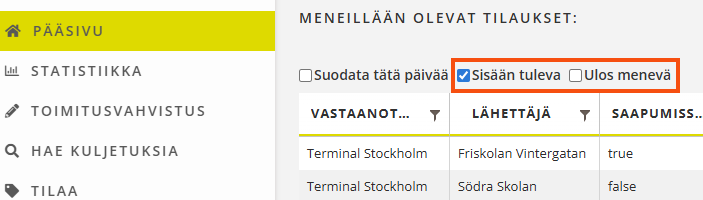 Terminal-verkkosivustolla päävalikon luetteloa voi nyt suodattaa Sisään tuleva ja Ulos menevä -tilauksien perusteella.