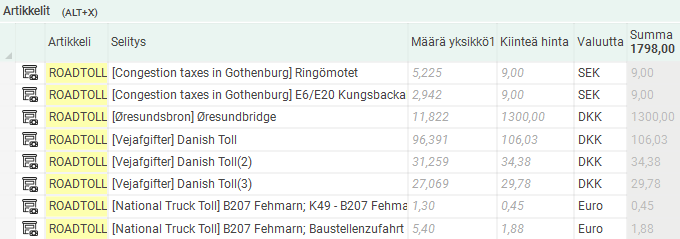 Kun tilaus luodaan hinnastoilla, palveluilla ja hintaperusteisilla ajoneuvolajeilla, joille on asetettu tiemaksuja, tiemaksuartikkelit lisätään tilaukseen automaattisesti. Artikkelirivin kuvauksesta käy ilmi, mitä siltaa, tunnelia, tieosuutta tai asemaa maksu koskee, jos olet valinnut tiemaksujen näyttämisen yksitellen. Jos sen sijaan olet valinnut tiemaksujen ryhmittelyn, näytetään artikkelirivi, jossa on laskettu yhteen esimerkiksi kaikki maan siltamaksut tai välimatkoihin perustuvat tiemaksut.