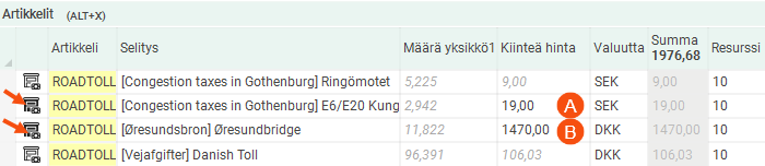 Yllä olevissa kuvissa näkyy, miltä tiemaksun kohteen kuvake näyttää ja että kohderivin kuvake muuttaa ulkoasua, jos muutat summaa sarakkeessa Kiinteä hinta, kilometrimäärää sarakkeessa Määrä yksikkö1 tai resurssia sarakkeessa Resurssi. Jos kilometrimäärä on syötetty manuaalisesti, luvut näytetään tavallisella mustalla tekstillä, katso (A) ja (B) yllä olevissa kuvissa.