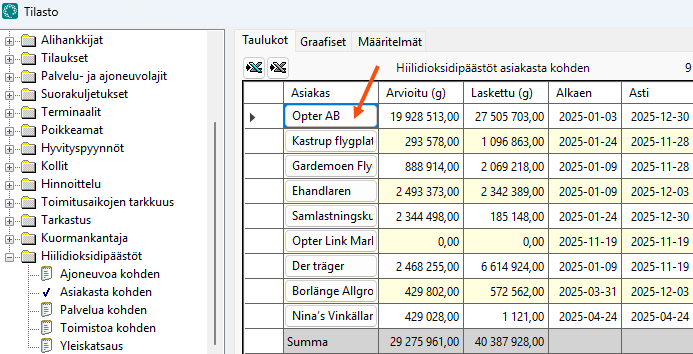 Napsauta tilastoraporttia, jonka haluat luoda, esimerkiksi Alihankkijat.