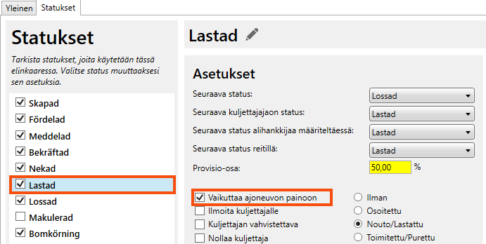Valitse Asetukset > Elinkaaret ja statukset > välilehdellä Statukset. Valitse tila (esimerkiksi Lastattu) ja tarkista asetus valintaruudusta Vaikuttaa ajoneuvon painoon.