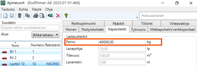Valitse Hakemisto > Ajoneuvot ja välilehti Kapasiteetti. Laatikko Lastaustiedot sisältää kentän Paino. Kentässä Paino ilmoitetaan suurin paino, jonka ajoneuvo voi kantaa.