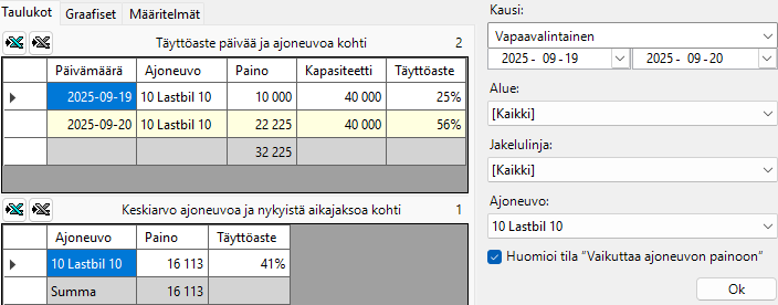 Taulukosta Täyttöaste päivää ja ajoneuvoa kohti voi esimerkiksi käydä ilmi, että tietty ajoneuvo oli tiettynä päivänä kuormattu 85 prosenttiin sen enimmäiskapasiteetista.
