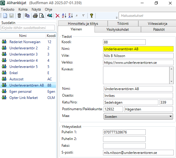 Osa tiedoista, jotka syötät alihankkijalle välilehdille Yleinen, Yksityiskohdat ja Hinnoittelu ja tilitys, lähetetään esimerkiksi Fortnoxille toimitettavassa selvitysviennissä. Lisätietoa: Tilitysvienti Fortnoxiin.