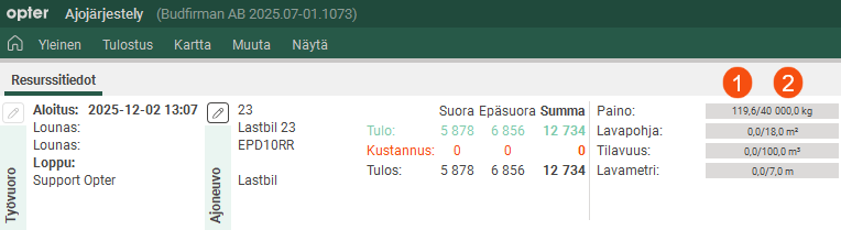Vakiomitat ja mahdolliset lisämitat näkyvät ajojärjestelyn ruudussa Resurssitiedot. Alla olevan kuvan kohdassa (2) näkyy arvo, jonka olet syöttänyt (esimerkiksi kenttään Paino) ajoneuvorekisterin välilehdellä Kapasiteetti, tai toissijaisesti ajoneuvotyyppirekisterin arvo.