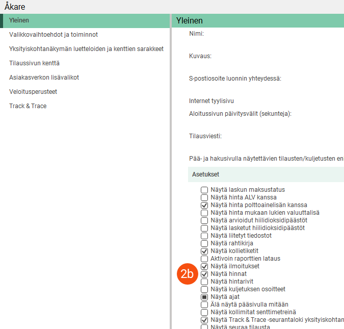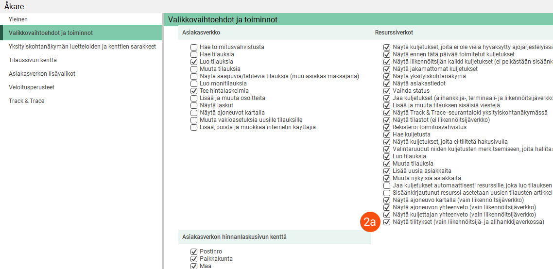 Kun aktivoit ominaisuuden internettilausasetuksissa, se otetaan käyttöön kaikilla liikenteenharjoittajilla, joilla on kyseiset internettilausasetukset. Tarkista, onko käyttäjiä, joiden ei pitäisi voida nähdä tilityksiä, ja jos on, poista valinta Tilitykset näiden liikennöitsijäviitteiden kohdalla.