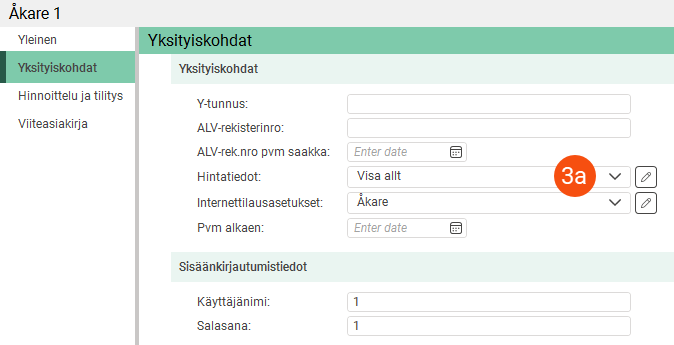 Kun aktivoit ominaisuuden internettilausasetuksissa, se otetaan käyttöön kaikilla liikenteenharjoittajilla, joilla on kyseiset internettilausasetukset. Tarkista, onko käyttäjiä, joiden ei pitäisi voida nähdä hintoja, ja jos on, poista valinta Näytä hinnat näiden liikennöitsijäviitteiden kohdalla.