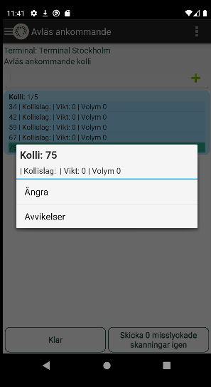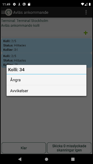 Trykk lenge på et kolli og velg om du vil avbryte skanningen eller registrere et avvik.
