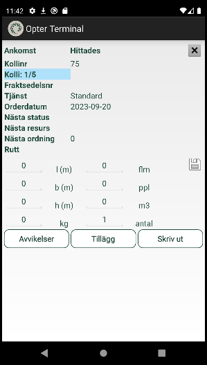 Trykk på et kolli for å åpne detaljvisningen, der du kan endre dimensjoner (f.eks. vekt og volum), registrere avvik og tillegg eller skrive ut en ny kollietikett.
