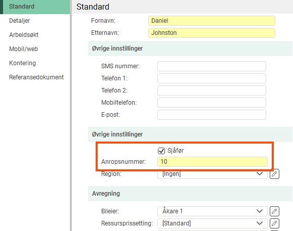 Velg en ansatt i listen til venstre, og velg deretter Sjåfør på fanen Standard. Du må også angi et anropsnummer for sjåføren. Hvis sjåføren ikke er oppført som ansatt, legger du ham eller henne til ved å klikke på Ny.