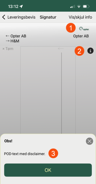 Hvis du ønsker å vise en tekst på signatursiden, for eksempel en ansvarsfraskrivelse, legger du den inn på fanen Leveringsbevis (POD) i kunderegisteret. Klikk på (2), så vises teksten (3).