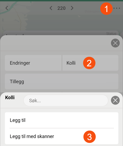 Som standard kan ikke sjåførene legge til pakker i bestillinger ved å skanne dem, men du kan stille inn appen slik at sjåførene kan gjøre det. Menypunktet Legg til kolli med skanner vises i detaljvisningen etter at føreren har trykket på Kolli.
