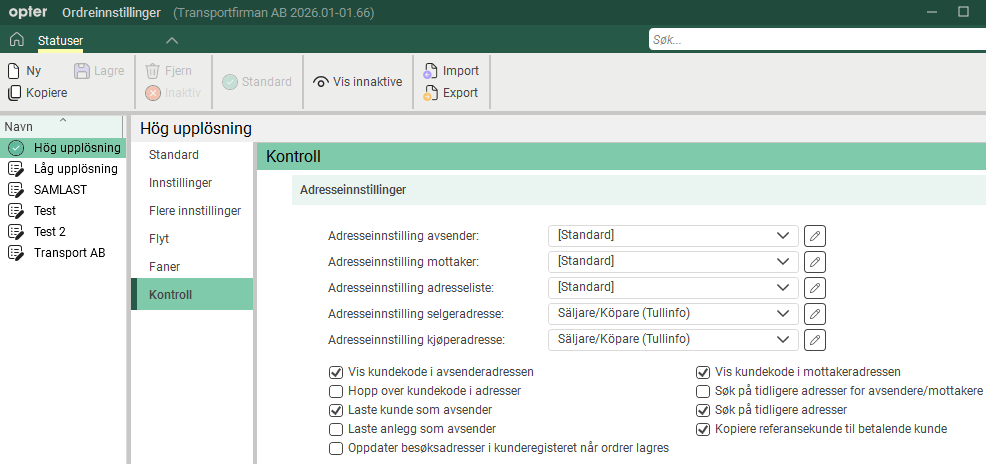 Her kan du angi hvilke typer bompenger Opter automatisk skal opprette bompengeartikler for, og om artiklene skal vises enkeltvis eller gruppert.