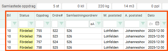 Bildet nedenfor viser hvordan det kan se ut i trafikkledelsen når vi har lagt til kolonnen Samlastingsordrenr..
