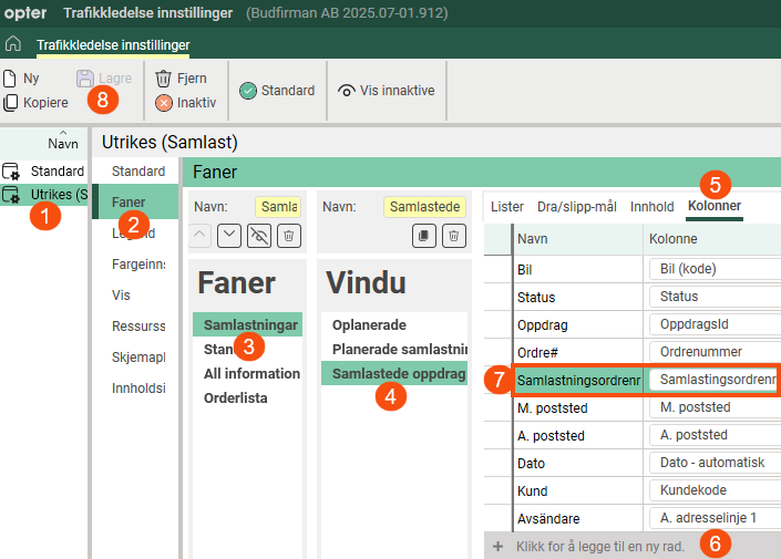I kolonnen Kolonne velger du Samlastingsordrenr.. (Her vises navnet på Opter-systemet i kolonnen).