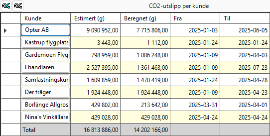Du kan produsere en statistikkrapport manuelt når du vil og så ofte du vil. Mer informasjon er tilgjengelig i Opprette statistikkrapport over CO2-utslipp i gram. Bildet nedenfor viser hvordan det kan se ut hvis du velger å vise statistikken per kunde. Flere detaljer vises hvis du klikker på kundens navn.