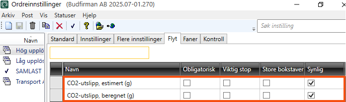 I ordrekontrollen kan du vise CO2-utslipp ved å legge til følgende kolonner: