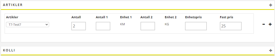 Fast pris under Artikler. Henter prisen på artikkelen fra prislisten, hvis prisen er en fast pris. Du kan overskrive prisen fra prislisten med en manuell pris. Hvis du inkluderer dette feltet, bør du også inkludere Antall (artikkel) ettersom de fungerer sammen. Den faste prisen multipliseres med antallet av artikkelen (Antall). Totalprisen for artikkelen i eksempelet nedenfor er 2 × 25 = 50. Artikler må være inkludert, ellers vises ikke dette feltet slik det er under den aktuelle seksjonen.