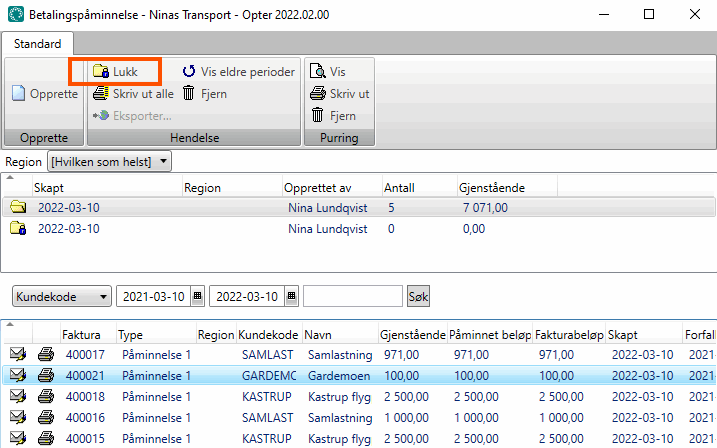 Når du har sett på betalingspåminnelsene og fjernet de som ikke skal sendes ut, kan du lukke hendelsen ved å klikke på Lukk. Da kan du ikke lenger fjerne påminnelsene, og funksjonen for å eksportere betalingspåminnelsene blir tilgjengelig.
