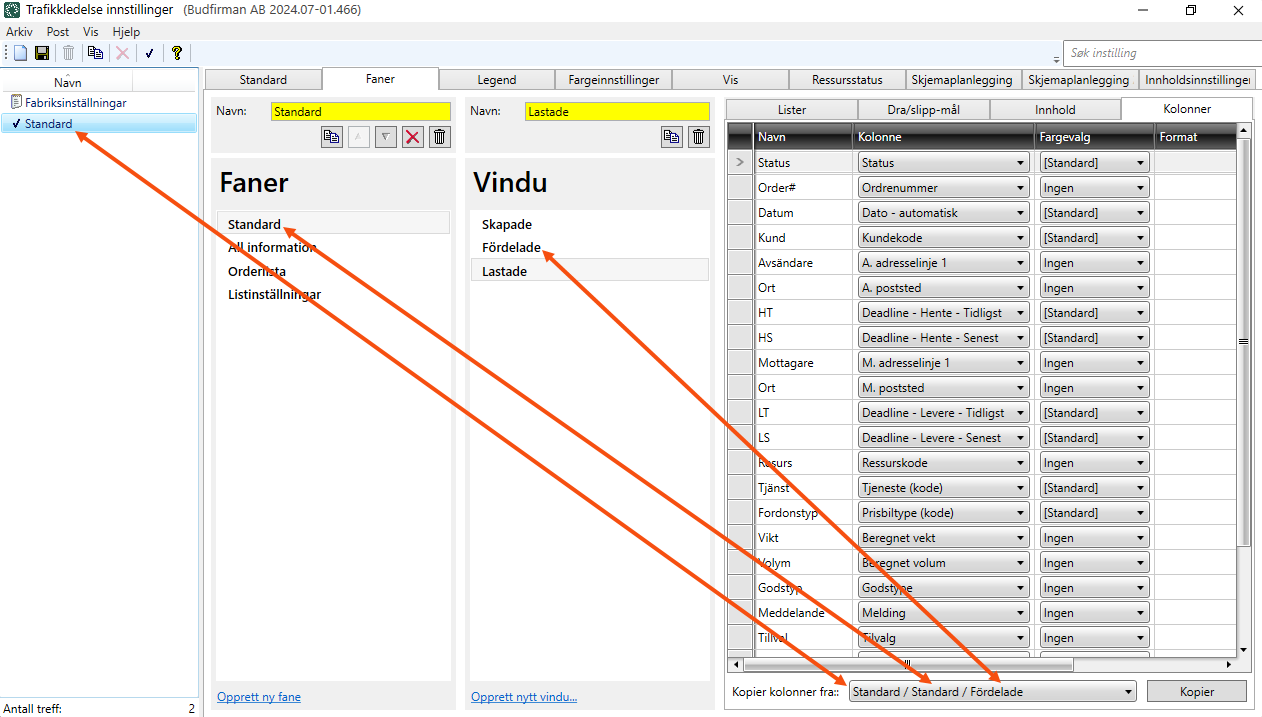 Gjør plass til det nye vinduet ved å flytte vinduene Tildelte og Lastede. Velg først Tildelte under Vindu og fyll ut følgende på fanen Standard: