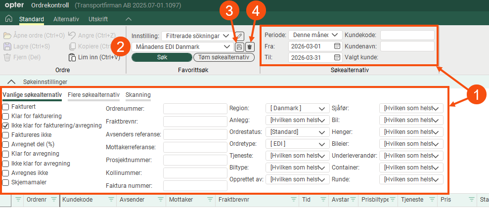 Du kan lagre søk du bruker ofte, slik at du raskt kan bruke dem igjen. Mer informasjon er tilgjengelig i . [Standard]: Søker etter dagens ordrer som ikke er klare for fakturering. Du kan endre søkeinnstillingene, men de tilbakestilles når du lukker kontrollen. Hvis du vil lagre et søk, angir du de innstillingene du ønsker å søke på (1), skriver inn et navn i feltet (2) og lagrer det (3). Du sletter et lagret søk med