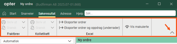 Hvis du synes at menyområdet (båndmenyen) tar for mye plass i vinduet Ordremottak, kan du lukke menyen ved å trykke Ctrl + F1 eller ved å klikke på opp-pilen helt til høyre i vinduet.