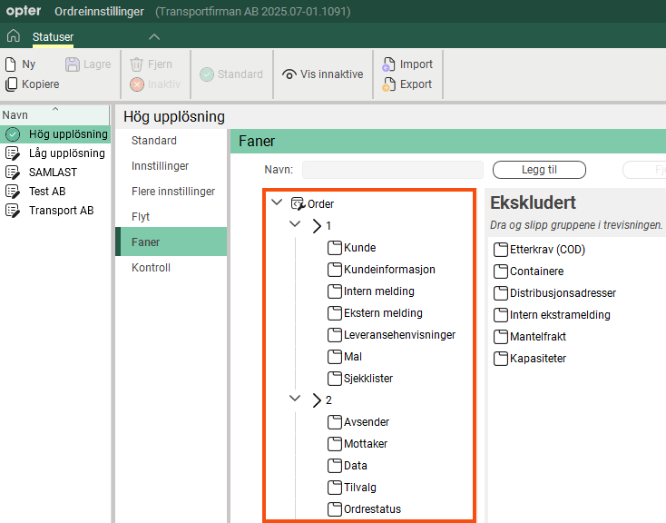 Merk av fanen (mappen) eller gruppen du vil fjerne fra ordremottaket. Klikk på Fjern.
