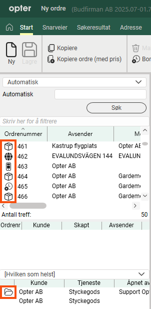 Helt til venstre i ordremottaket kan det vises ikoner slik at du raskt kan se hvilke ordrer som for eksempel er internettordrer, samlastingsordrer, bomturer, og hvilke ordrer som for øyeblikket er åpne hos noen andre. Bildet viser hvordan ordremottaket kan se ut i det nye designet. (Opter i ny design er tilgjengelig fra 2025.12.00 og 2025.07.831+).