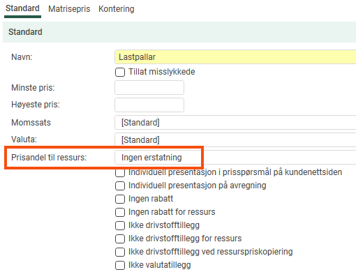 Gå til fanen Standard og velg Ingen erstatning fra rullegardinmenyen Prisandel til ressurs.