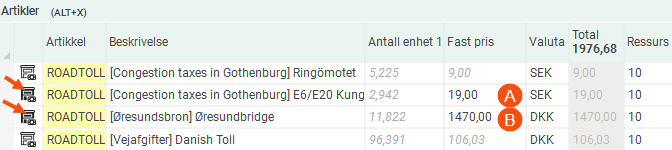 Når det opprettes en ordre med prisliste, service og prisbiltype som du har angitt veiavgift for, vil artikler for veiavgiftene legges til ordrene automatisk. Beskrivelsen på artikkellinjen viser for eksempel hvilken bru, tunnel, veistrekning eller bomstasjon avgiften gjelder for, hvis du har valgt å vise veiavgiftene enkeltvis. Hvis du i stedet har valgt å gruppere veiavgiftene, vil du se en artikkellinje der for eksempel alle bruavgifter for et land summeres, eller der alle strekningsbaserte veiavgifter i et land summeres.