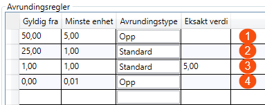 Hvis du vil at verdien skal avrundes til en eksakt verdi, for eksempel "5,00". I eksemplet i tabellen ovenfor vil for eksempel en prisvekt eller en volumvekt som ligger i området "1,00" til "24,99", bli avrundet til "5,00", i henhold til reglene i rad 3. |