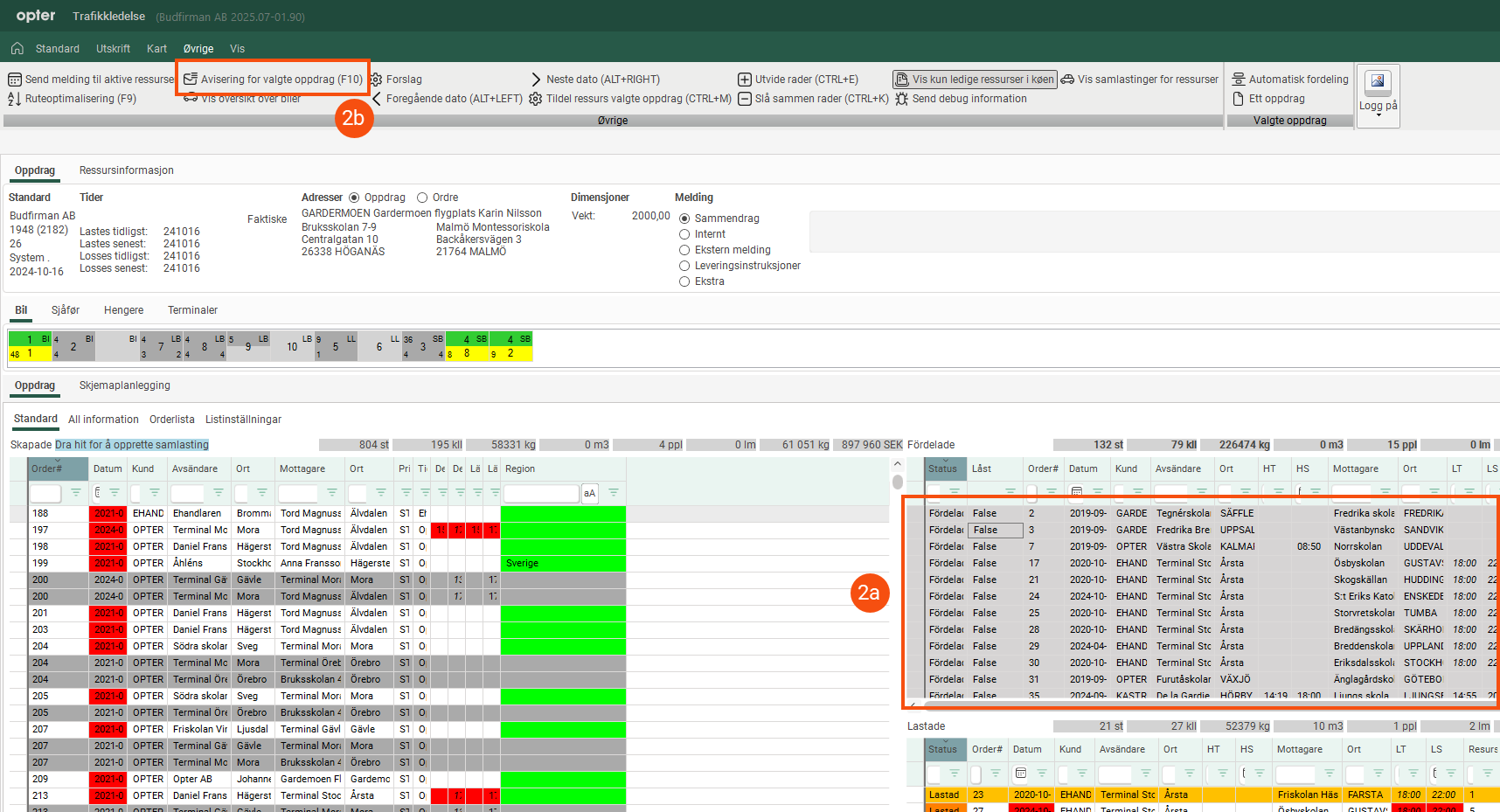 For å sende varsler med leveringstider til mottakerne, markerer du oppdragene i trafikkledelsen og trykker F10.