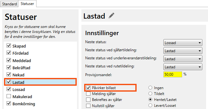Klikk på Innstillinger > Livssykluser og statuser > fanen Statuser. Velg status (for eksempel Lastet), og merk av for innstillingen i avmerkingsboksen Påvirker billast.