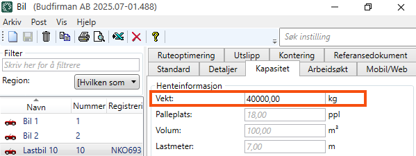 Klikk på Register > Bil og fanen Kapasitet. Henteinformasjon -boksen inneholder feltet Vekt. Feltet Vekt angir den maksimale vekten som bilen kan bære.