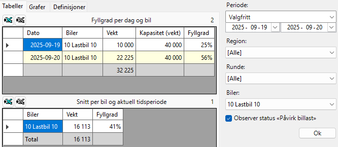 Tabellen Fyllgrad per dag og bil kan for eksempel vise at et bestemt kjøretøy var lastet til 85 % av sin maksimale kapasitet på en bestemt dag.