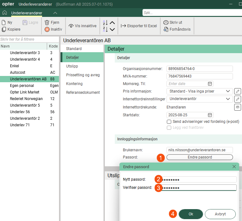 E-postadressen som brukes, er den du har angitt i E-post -feltet på Standard -fanen i underleverandørregisteret.