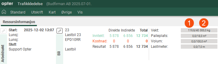 Standarddimensjonene og eventuelle tilleggsdimensjoner vises i ruten Ressursinformasjon i trafikkledelsen. Ved (2) i bildet nedenfor vises verdien du har skrevet inn i for eksempel feltet Vekt på fanen Kapasitet i kjøretøyregisteret eller, alternativt, verdien i for eksempel feltet Vekt på fanen Kapasitet i registeret for kjøretøytyper.