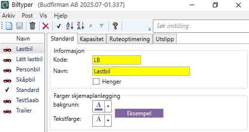 I dette vinduet foretar du innstillinger for de biltypene som du er trafikkleder for. Dette har blant annet betydning for ruteoptimering og hvordan oppdragene utføres.
